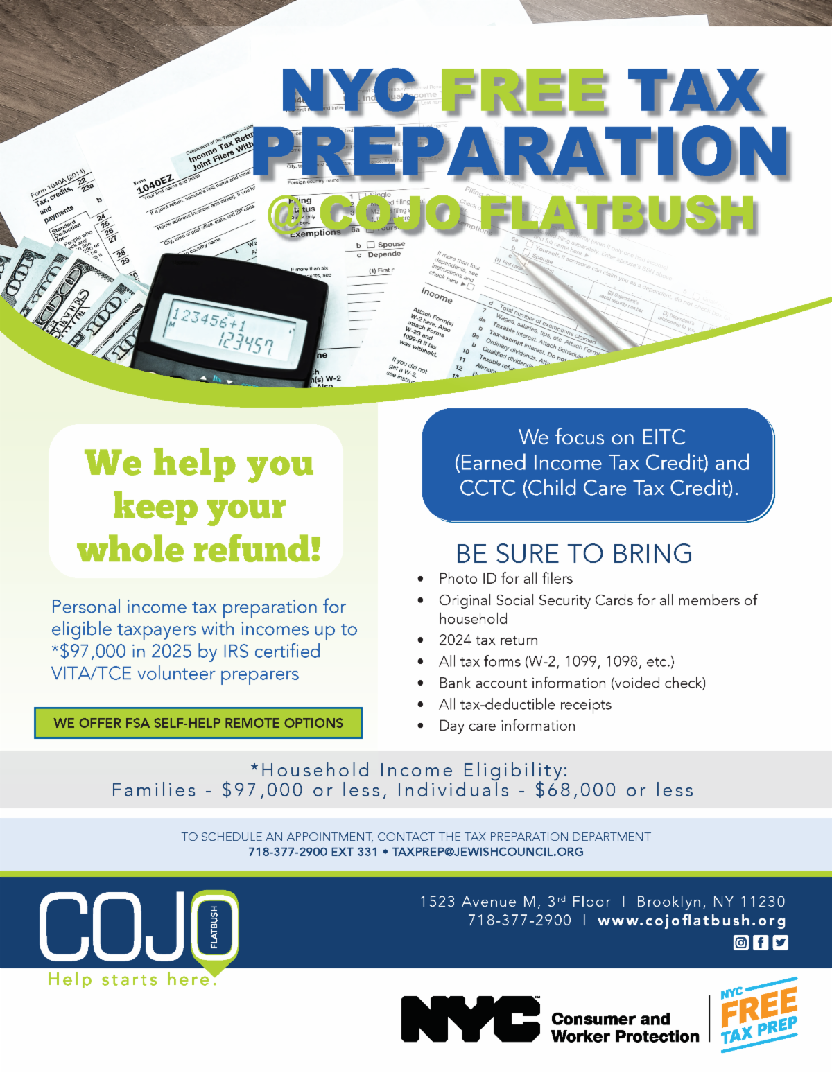 - Personal income tax preparation for eligible taxpayers with incomes up to $68,000 (individuals) – $97,000 (families) in 2025 by IRS certified VITA/TCE volunteer preparers. Also offers FSA self-help remote options. To schedule an appointment, contact the Tax Preparation Department at 718-377-2900 extension 331 or email taxprep@jewishcouncil.org.