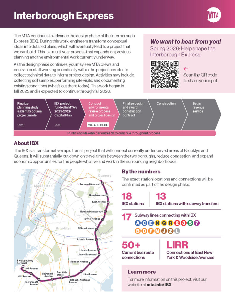 Summary Description: The Interborough Express (IBX) is a transformative rapid transit project that would connect currently underserved areas of Brooklyn and Queens.