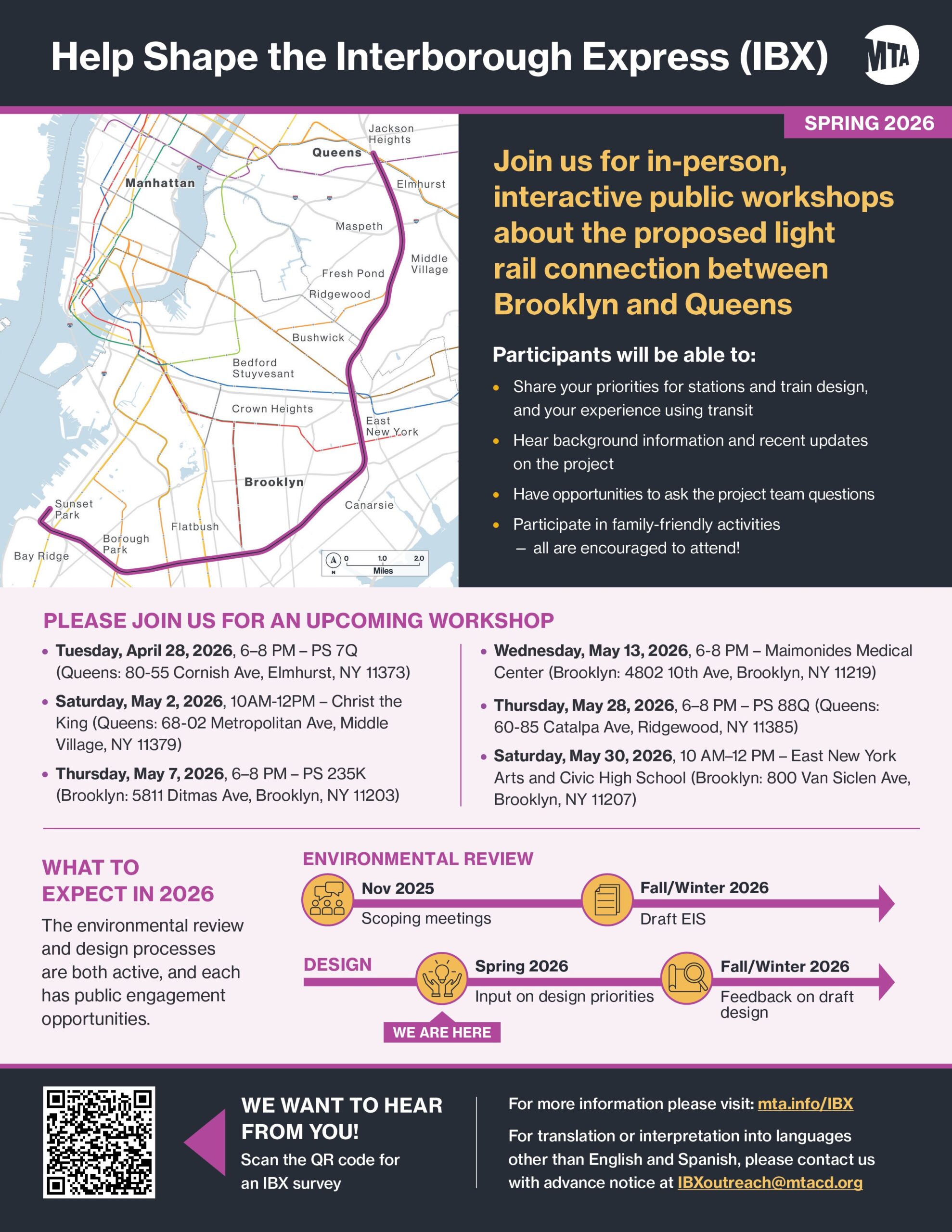 MTA held a second virtual public meeting on plans for IBX. This town hall provided an update on the planning process and factors under consideration. Press ReleaseWatch Meeting