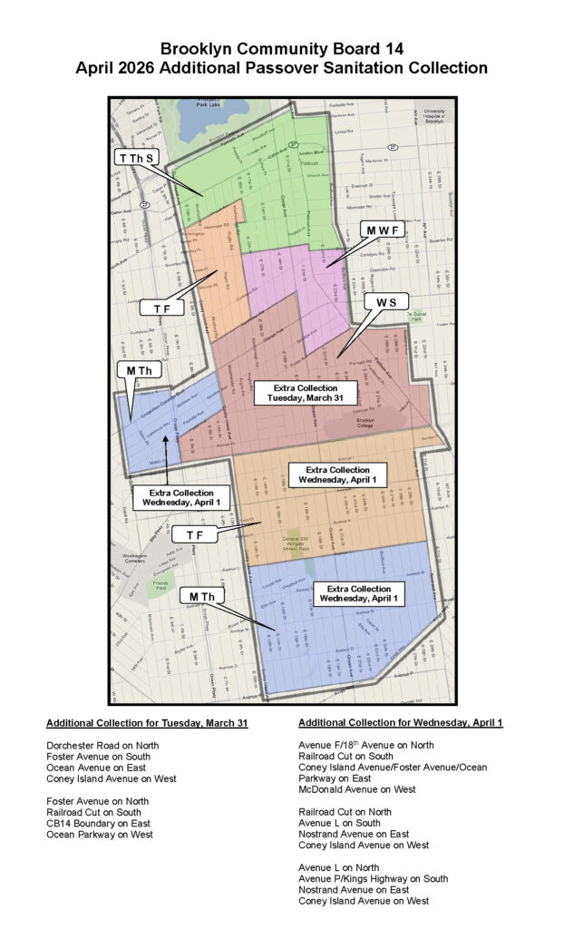 Brooklyn Community Board 14 is pleased to announce that Department of Sanitation Commissioner Gregory Anderson has approved additional Sanitation collection services in portions of the district to assist residents in preparation for Passover observances, which commence at sundown on Wednesday, April 1, 2026. The plan provides for additional collection services.